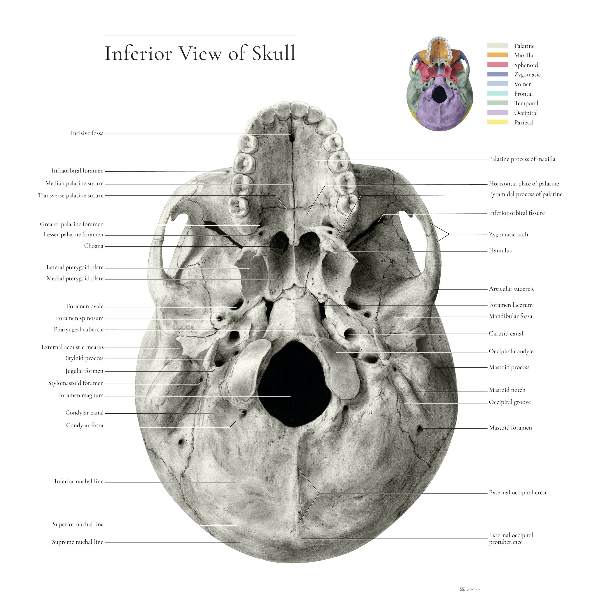 Interior View of the Inferior Skull - Anatomical Justice Interior View of the Inferior Skull. SKU: S04025. This exhibit depicts the anatomy of interior skull base including: the anterior cranial fossa, cribriform plate, superior orbital fissure, optic canal, internal acoustic meatus, jugular foramen, sphenoid bone, occipital bone, and foramen magnum. inferior skull anatomy Bones: Skull, mandible. - Anatomy & Physiology. 11 Pics about Bones: Skull, mandible. - Anatomy & Physiology : Multi-colored Skull, inferior view close-up with labels - … | Flickr, Anatomy and Function of the Occipital Bone Explained With a Diagram and also Bones: Skull, mandible. Inferior view of the skull. | Skull anatomy, Skeletal system anatomy ... This exhibit depicts the anatomy of the inferior skull including: the foramen magnum, occipital condyles, mastoid process, styloid process, mandibular fossa, palatine bone, sphenoid bone, carotid canal, and the jugular fossa. E Emely cale Pish Posh Medical Anatomy Palatine Bone Axial Skeleton Study Bones Axial Skeleton flashcards. Human Skull Anatomy Inferior View (Illustrations) - Human Bio Media The skull (cranium) is the skeletal structure of the head that supports the face and protects the brain. It is subdivided into the facial bones and the cranial bones. The facial bones underlie the facial structures, form the nasal cavity, enclose the eyeballs, and support the teeth of the upper and lower jaws.