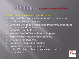 Product and Outer Package Labeling Requirements for Durable Infant or ... Manufacturers are required to attach the registration form to the surface of the product so the consumer notices and handles the form after purchasing the product. Manufacturers must also keep records of consumers who register their products with the manufacturer. PDF Number 384 - Revised January 2009 LABELING REQUIREMENTS FOR ... The ATCM specifies the minimum information required for a label but does not specify the format, color, size, or font for the label. These choices are left to the manufacturer or fabricator to allow flexibility to meet the needs of individual companies . All required information must be in readable English and not in code. What Required Information Must GHS Labels Include? - MPC Manufacturer information - GHS labels must include the manufacturer's name, as well as contact information including an address and phone number. Product Labeling Regulations in the US, EU and Australia Here are few labeling requirements for imported products: a. The label must contain the identity of the prepackaged product in terms of its function or generic name. b. The label must contain the principal place of business and identity of the manufacturer or dealer. c.