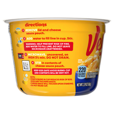 Velveeta Shells and Cheese Original Shell Pasta & Cheese Sauce Dinner ... Nutrition facts Refer to the product label for full dietary information, which may be available as an alternative product image. 3.0 Servings Per Container Serving Size 4 oz (112g/ about 1/3 box) (Makes about 1 cup) Amount per serving Calories 370 Velveeta Shells & Cheese Pasta with Cheese Sauce ... - My Food and Family This smooth, creamy velveeta cheese sauce is made with 2% milk cheese for half the fat of regular shells and cheese. It's the perfect match for any meal. Just grab a fork and dig in. You won't believe your taste buds. The best side of dinner. This product: 4.5g fat; regular shells & cheese: 12g fat. Nutrition. Calories. Kraft Velveeta Original Shells & Cheese - Shop Pantry Meals at H-E-B Preparation instructions. Boil: 1-1/2 qt. (6 cups) water in saucepan. Stir in shell pasta; cook 8 to 10 min. or until tender, stirring occasionally. Velveeta Shells and Cheese Pasta with Cheese Sauce & 2% Milk Cheese ... Nutrition facts. Refer to the product label for full dietary information, which may be available as an alternative product image. ... VELVEETA Shells and Cheese Made With 2% Milk Cheese gives you all the goodness of liquid gold, but with half the fat of regular shells and cheese. Smooth, creamy and undeniably VELVEETA, the combination of shells ...