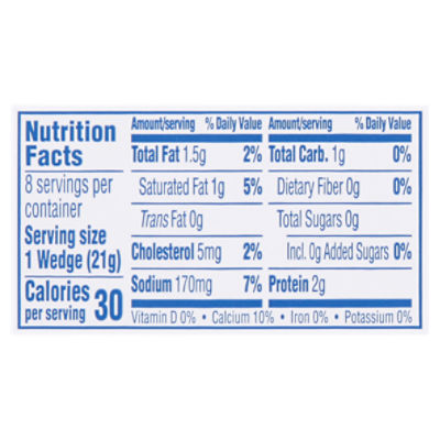 The Laughing Cow Cheese, Light Swiss Snack Wedges, 6 oz Product Dimensions : 4.5 x 1 x 4.5 inches; 6.08 Ounces. Item model number : mburring. UPC : 041757011062. Manufacturer : Bel /Kaukauna USA. ASIN : B000Q6LY26. Best Sellers Rank: #174,042 in Grocery & Gourmet Food ( See Top 100 in Grocery & Gourmet Food) #26 in Packaged String & Snack Cheeses. Calories in Laughing Cow Creamy Light Swiss Cheese Wedge Laughing Cow Creamy Light Swiss Cheese Wedge Serving size 100 g ( 100 g) Amount Per Serving Calories 143 % Daily Value* Total Fat 7g 9% Saturated Fat 5g 24% Trans Fat 0g Polyunsaturated Fat -g Monounsaturated Fat -g Cholesterol 24mg 8% Sodium 857mg 37% Total Carbohydrate 5g 2% Dietary Fiber (per old FDA rule) 0g 0% Dietary Fiber 0g 0% The Laughing Cow White Cheddar Cheese - 6oz : Target Spreadable White Cheddar cheese great for snacking. 8 perfectly portioned sized snack wedges made with real cheese. Creamy White Cheddar Flavor, with tangy and distinctive taste. 2g of protein and 35 calories per wedge. No artificial flavors, colors, or growth hormones.