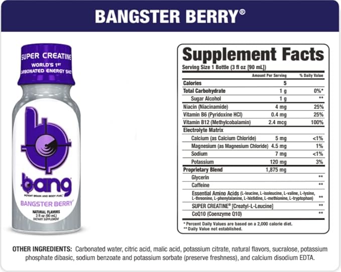 Bang Energy Drink Ingredients (Details) - energydrinkland.com It's best to look at the ingredients label first before buying Bang energy. It's the most important thing printed on the packaging of an energy drink. ... Bang energy contains super creatine, which is a unique ingredient in Bang energy and makes it different from all the other energy drinks in the market. Creatine is a compound formed ...