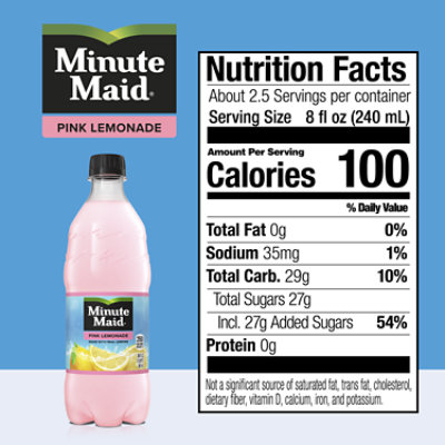 › products › lemonade-and-fruitPink Lemonade - Lemonade & Fruit Drinks | Minute Maid® 59 fl oz carton A twist on something sweet, Minute Maid Pink Lemonade is made with real lemons for a deliciously sunny, smile-inducing taste that truly refreshes. 13% FRUIT JUICE