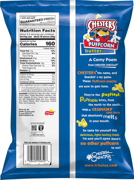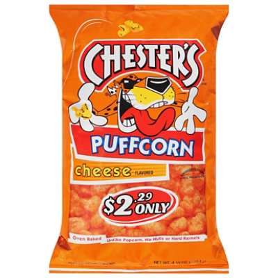 CHESTER'S® Butter Flavored Puffcorn Snacks | FritoLay CHESTER'S® Butter Flavored Puffcorn Snacks | FritoLay When CHESTER CHEETAH puts his name on a snack, you can count on a bold and cheesy flavor like you've never tasted. CHESTER'S ® snacks are made with a special blend of real cheese seasoning to give each bite the perfect pop and zing. Buy Online Nutrition Facts